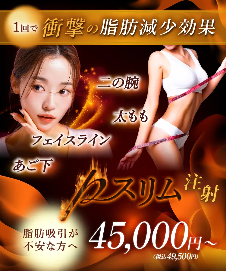 pスリム注射は確実に脂肪溶解効果をだしながらも、たるみやへこみを起こさない程度に自然な皮下脂肪は残す注射です。また、皮膚の引き締め効果がある成分も含まれているため、注射の後に皮膚がたるんだと感じることはほぼありません。