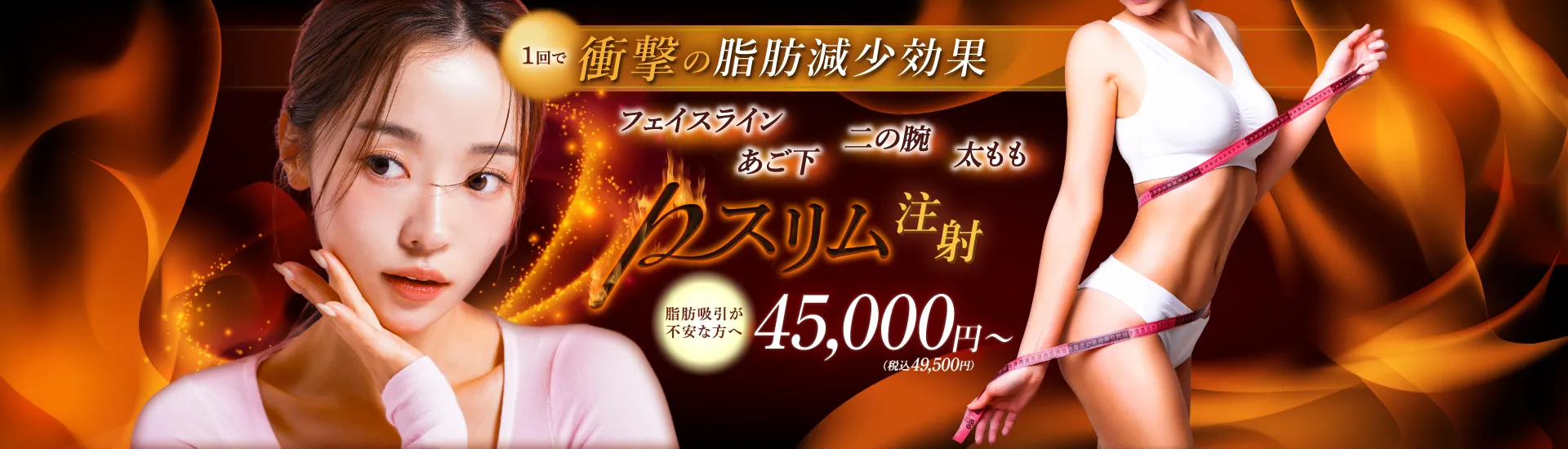 お尻や太ももは皮下脂肪が厚いうえに、範囲も広いため、脂肪吸引のほうが効果やご費用面で優れている場合があります。しかし、太ももの内側のみや、バナナロールと呼ばれるおしり脂肪の一部であれば、pスリム注射でも治療可能です。